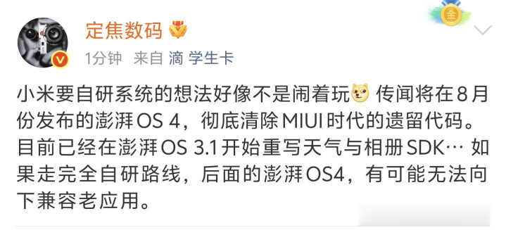 就在我撰写这篇文章时,有部分博主爆料,小米或许会在澎湃OS 4阶段大规模推进自研,全面剔除MIUI时代的老旧代码,甚至可能出现不兼容老应用的情况。